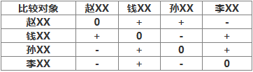 [单选题]某企业财务部门运用一一对比法对所属的4名员工进行绩效考核,考核情况如下表所示(“+”表示考核对象比比较对象绩效水平高,“0”表示两者绩效水平相同,“一”的含义与“+”相反):